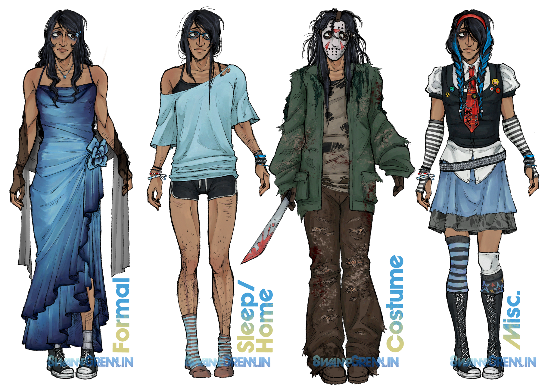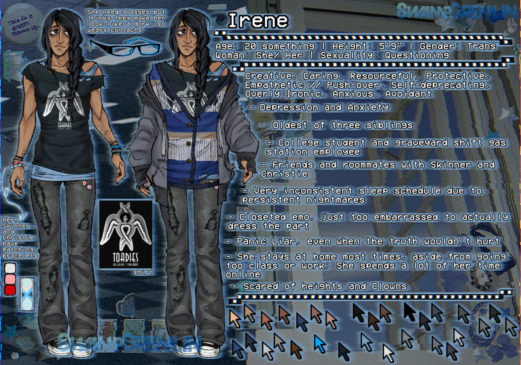 Irene is truly the most concentrated distillation of sopping wet cringefail girl who is horribly riddled with anxiety, and has the irrational anxiety mindset of “everyone wants to kill me with hammers” as a result she’s mostly a shut in, only really leaving her apartment for class, or work, and not much else. She constantly teeters on the line of being caring and a massive push-over, she really cares for the people around her but never really speaks up when people are asking too much. Loves to create but often finds herself too tired or out of it to really commit how she wants.